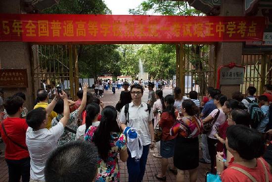 昨日(6月7日)下午,广州市培正中学。高考首日结束后考生步出考场,家长们在为子女拍照。摄影 张家乐。
