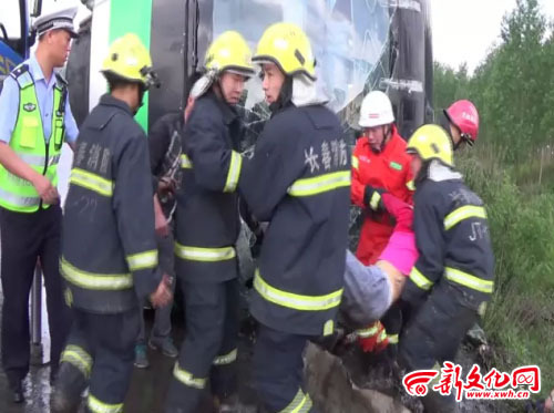 记者赶到现场,侧翻客车已被扶起,拖车正准备将其拖走。客车风挡玻璃全部破碎,车身右侧都是划痕。高速公路右侧护栏严重变形,遍地的玻璃碎片和乘客遗落的玩具、饮料瓶等,路政人员正在清理现场。多数乘客已经砸碎车前风挡玻璃逃生,有5个成人和1个男孩被困。由于事故发生时巨大的惯性,这6名被困乘客下半身在车内,上半身却被甩出车外,被左侧车身压住。经过120急救人员确认,5名被困成人已经死亡,受伤男孩随即被送往医院救治。