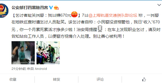 公安部治安管理局暨打四黑除四害专项行动办公室官方微博@公安部打四黑除四害今日发布微博:7日@上海轨道交通俱乐部论坛称,一民警在地铁巡查时遭乞讨人员耻笑。该乞讨者自称:小民警没资格管他,我日“收入”670元,你一个月累死累活才挣多少钱!