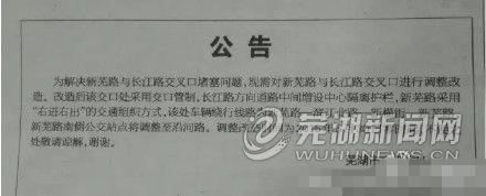 因道路升级改造,5月30日开始,临江桥头希尔顿酒店门口,南北方向只能直行加右转(长江路只能直行上临江桥和右转至希尔顿酒店沿河路),东西方向只能右转(新芜路不能直行进希尔顿或左转上临江桥)。今天开始,禁令标志、引导标识全面到位,此前网传的一次扣6分纯属虚构,所谓6分一次,即闯红灯记6分,不按道路行驶记3分。土豪请随意!