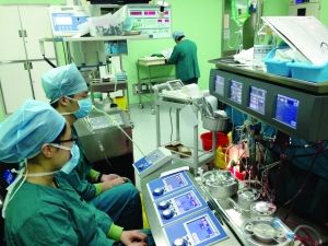 手术中,两名医生时刻盯着体外循环机,并监控胎心状态 鼓楼医院供图