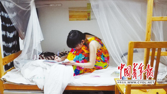晚上,皮怡纯在床铺上复习白天的培训内容。