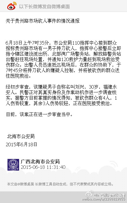 据广西北海市公安局官方微博消息,18日上午7时35分,广西北海贵州路市场一男子持刀砍人,警方在群众的协助下将嫌疑人制伏。北海市公安局通报称,事件共造成4人受伤。目前,该案正在进一步审查中。