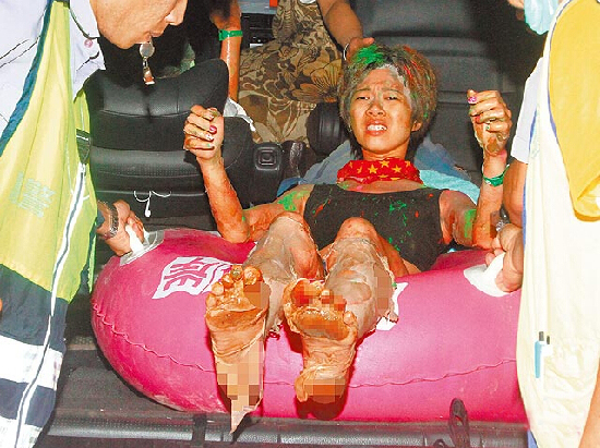 图为一名女性伤者在送医时身上还残留有彩粉。“彩色派对~八仙水陆战场”27日晚间在八仙乐园接近结束时,发生粉尘爆炸,由于许多游客都未着上衣,遭灼烧。有游客说,爆炸时有人全身都是火,现场惨叫声四起,相互推挤,有如人间炼狱。