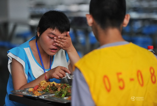 鲁莽的行为让这个家庭陷入更大的窘迫,2015年3月18日,李小明以抢劫罪被判入狱三年半,服刑地是江西未管所成年犯监区。图为张冬梅一边吃饭,一边落泪。