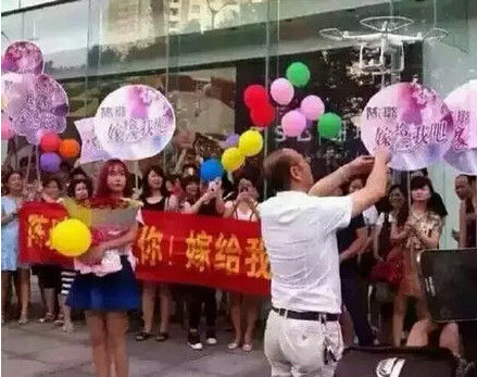 “现场发了红包,但我没拿到。”一名女促销员说,当时场面比较大,不仅有人举着示爱的牌子,拉着条幅,搭着鲜花拱门,电子大屏幕还在播放求爱视频。最终一个无人机把钻戒送到大叔面前,红发的女主角喜极而泣,两人相拥。