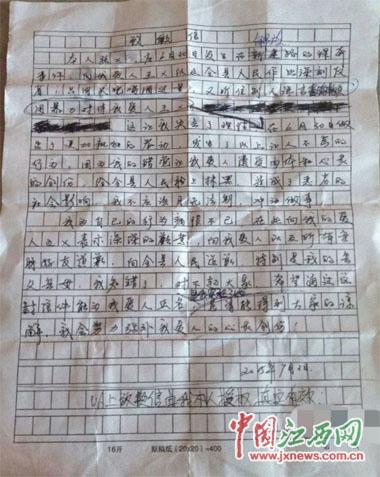 道歉信手稿,由于张某不识字,该手稿系张某授权他人代写