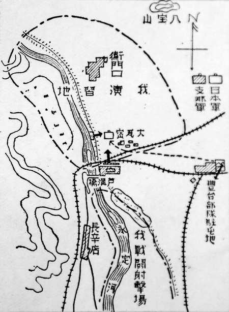 这是1937年7月事变发生时,日军绘制的卢沟桥地区形势地图。图中详细注明了卢沟桥附近地区地理状况、交通干线、中日军队部署及日军演习区域(资料照片)。