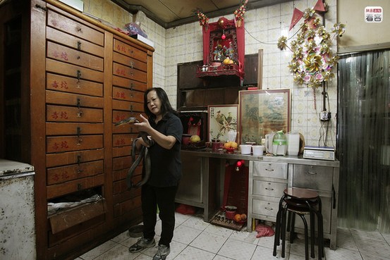 在香港,暴富神话和破产悲剧不断上演,香港自身的前途却始终未知。无论是李嘉诚这样的商界大亨还是平常百姓,每个人的命运都无法掌控。图为2013年1月29日,在蛇年来临之际,香港一个蛇羹店老板在屋内手握一条眼镜蛇。 REUTERS/Bobby Yip