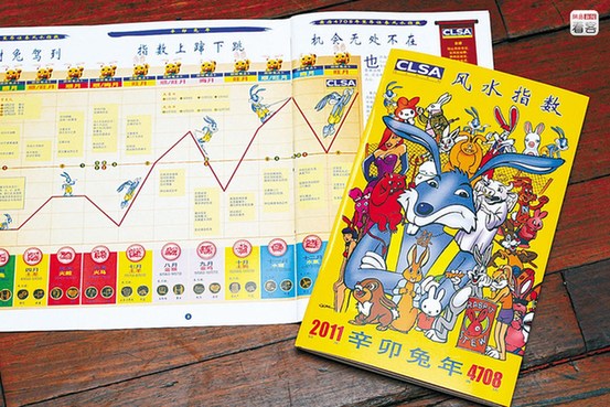 香港市面上有关风水命理的书籍多不胜数,主要是教人如何生财、旺姻缘、升职加薪、布置屋中家具电器,甚至如何于赌博中赢钱。据悉,里昂证券(CLSA)自1992年开始,在农历新年前都会发布“里昂证券风水指数”,在香港很受欢迎。图为2011年发布的里昂风水指数小册子。