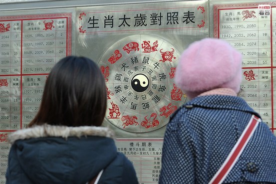 香港前身是广东沿海的小渔村,原住民从事着传统社会中风险最高的职业——捕鱼。被英国接管后,香港凭借优越的地理位置发展为转口贸易航运中心,商人成为社会主要阶层。渔业和商业这两大“不稳定”的职业,都使迷信在香港的土地上得以延续。图为2012年1月10日,两位游客在黄大仙庙观看墙壁上的“生肖太岁对照表”。Jens Kalaene