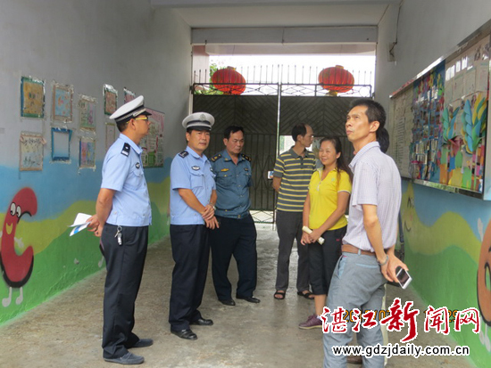 交警麻章大队姜红扬大队长联系多部门领导深入边区幼儿园了解学校的安全管理情况。