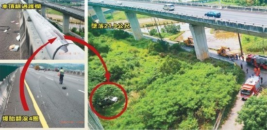 7月19日报道,台湾七名年轻男女7月18日上午高高兴兴共搭一辆厢型车,南下彰化参加大学同学婚礼,行经后龙交流道附近,疑似左后轮老旧爆胎失控翻滚,冲过护栏坠落约21.9公尺高的桥底,以相当于高铁的速度坠落,并以遭砂石车撞击的力道着地,酿成6死1重伤的惨剧。