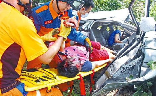警方指出,这起意外是近年来最严重的爆胎车祸事故。警方发现这辆厢型车车龄已16年,两个前轮胎龄3年,但左后轮、右后轮胎龄却高达13年,几无胎纹,明显老旧不堪使用,推测是爆胎酿祸。图为搜救人员从旅行车残骸内,救出被困者。