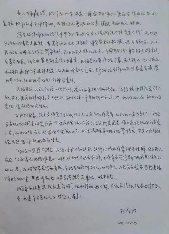 对于两封信件的内容,斯伟江认为,从信中可以看出林森浩还是很有担当的。“他自己做了错事,他能勇于承认,说明他的悔罪态度非常坚决,也很诚恳。”斯伟江说,两封信件也反映出林森浩在看守所的日子里确实看了不少书籍,“生命有了厚度”。