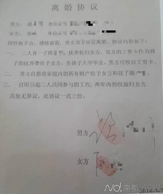 路某与张某离婚协议称愿将所有财产留给第二任妻子张某和儿子。受访者供图