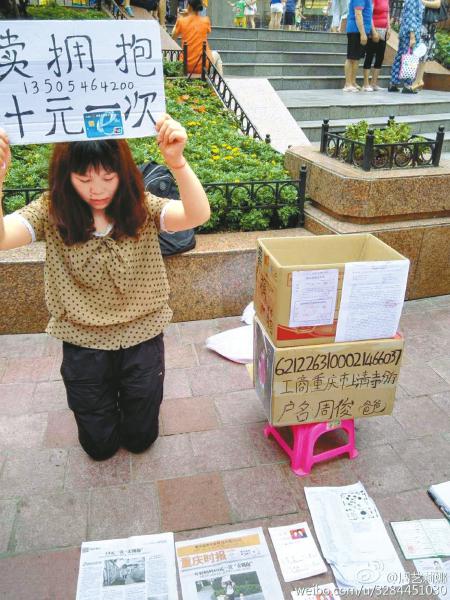 重庆朝天门,陈得娟在街头跪地卖拥抱,希望为孩子筹款治病。