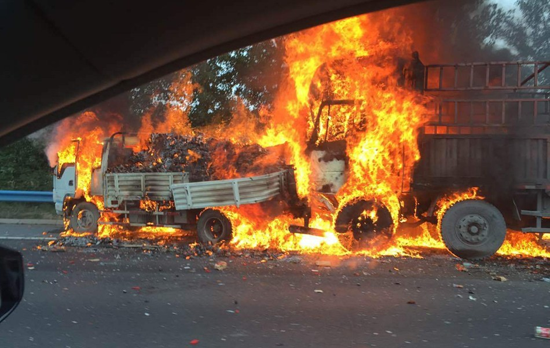 京港澳高速郑州段3车相撞 载酒货车起火