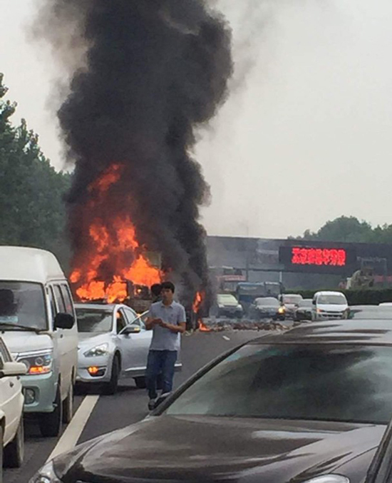 京港澳高速郑州段3车相撞 载酒货车起火