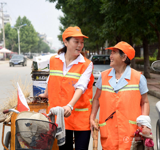 7月28日,大学生陈蒙恩和养母一起去清扫马路。