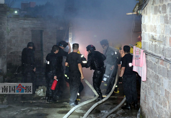 昨日下午,柳州市柳南区竹鹅村发生一起劫持人质案,特警和消防人员联合行动,成功解救人质,擒获犯罪嫌疑人。图为事发出租屋内冒出火光,特警在消防水雾掩护下破门而入。