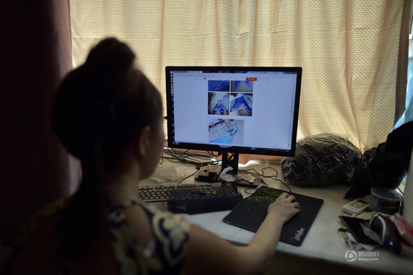 潘高洁在网上还开了一家网店,专卖自己做的人鱼服。客人想买,必须先下订单,之后她才会购买材料,然后制作。潘高洁表示,制作人鱼服难点在于鱼尾的重量和形状。制作一条鱼尾需要两个星期。让潘高洁最满意的是一件取名为“蓝色星空”的人鱼服,“一口气可以游20米。”