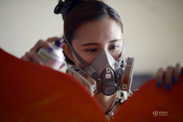 潘高洁戴上防毒面具,给人鱼服喷上美丽色彩。