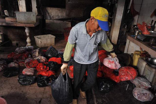 今天凌晨5点,佛山南海食药监局执法人员突击行动,在南海大沥镇水头社区潘村打击这个黑窝点,当时该作坊大门紧闭,正在进行烧腊加工制作,里面拒不配合,还有2个工人试图从后门逃跑。