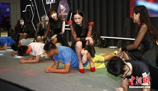 7月30日,中国国际数码互动娱乐展览会(ChinaJoy)在上海国际会展中心开幕,图为巨人展台showgirl坐在观众身上,让其做平板支撑的游戏。中新社发 张浩 摄