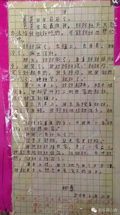 今天,推荐一篇小学作文,一篇世界上最悲伤的小学作文。文章的作者名叫苦依五木(笔名柳彝),一个来自大凉山的小学四年级彝族小姑娘。一个多月前,新华社记者范敏达曾深入大凉山,近距离接触了许多如苦依五木般的孩子,他用图文的形式,记录下了“不幸中依然保持纯真、贫穷中依然渴望学习”的孩子群像。图为小女孩写的作文。