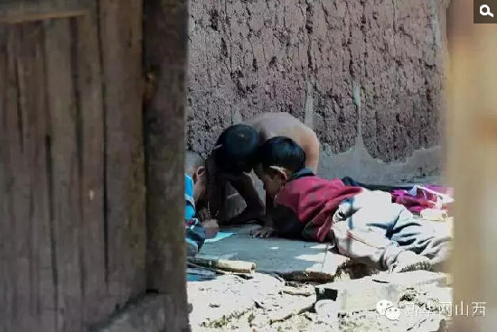 额其尔布今年已经17岁,却刚刚开始读初一。因为父亲早逝,母亲身体不好,两个哥哥也已成家,他成为了家里的顶梁柱,读完三年级便辍学在家干农活。图为6月24日,美姑县30多个麻风村之一的瓦基机村一户农家院落里,三个失学儿童趴在地上看书写字。