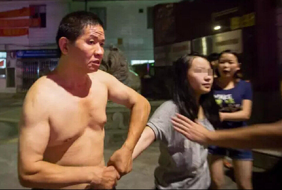 8月3日11时许,小梅和父亲易红桥从片区警务室里走出来,易红桥试图拉住女儿的手,但被推开了。这时一名街坊拿出手机开始播放视频,视频中一名女生卧倒在地上,一名中年男性在用右脚连踹女生腹部和胸部,女孩用双手护住胸口,不停发出惨叫声。视频中的场景发生在当晚9时许,施暴者和被施暴者正是易红桥及其女儿。易红桥当场解释:“女孩子不应该在外面乱吃别人的东西,坏人太多了,我怕她受骗。”小梅和父亲保持着数米的距离,双手环抱在胸前告诉记者,她今晚被打的原因,是在对面发廊里吃了一块鸭脖。