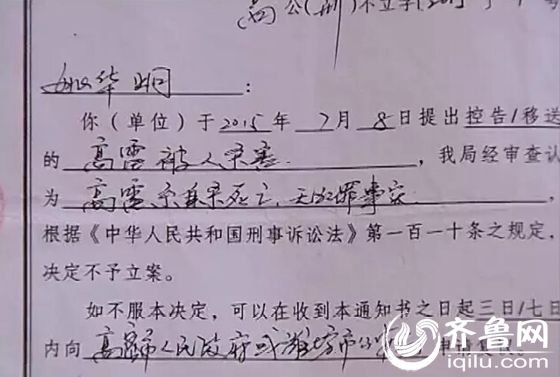 8月5号,煎熬等待的一家人终于接到了高密市公安局刑警大队的一份正式通知,可这通知内容姚华炯称实在难以接受。通知称:死者为自杀,没有发现犯罪事实,不予立案。
