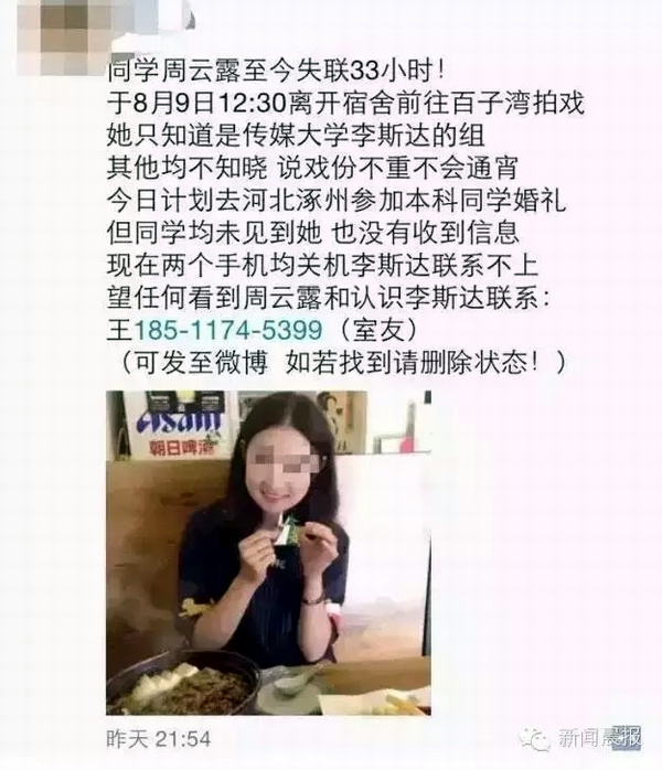 8月10日,一条关于寻找中国传媒大学女研究生周云露的消息在网上传开了。据微信公号中传人生活圈及相关微博,周云露系中国传媒大学2010级本科生、2014级研究生,“于8月9日12:30离开宿舍前往百子湾拍戏,她只知道是传媒大学李斯达的组其他均不知晓,说戏份不重不会通宵,今日计划去河北涿州参加本科同学婚礼但同学均未见到她。”至10晚上周某某的两个手机均已关机,与朋友同学失联。