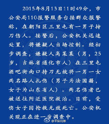 北京市公安局官方微博消息,朝阳区三里屯一男子无故持刀将一男一女两名路人扎伤,嫌疑人被当场控制,受伤女子抢救无效死亡。