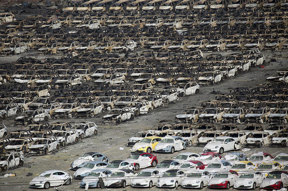 8月12日深夜,天津滨海新区一处危险品仓库发生爆炸。截至13日21时,爆炸事故共造成50人死亡,其中消防人员17人;住院治疗701人,其中重症伤员70人。除了人员伤亡惨重,爆炸现场附近数千辆进口新车被炸毁。据初步统计,被毁车辆包括甲壳虫391辆,迈特威770辆,UP84辆,高旅114辆,迈腾28辆,SportsVan39辆,Tiguan257辆,途锐1065辆,估计共烧毁汽车2748辆。