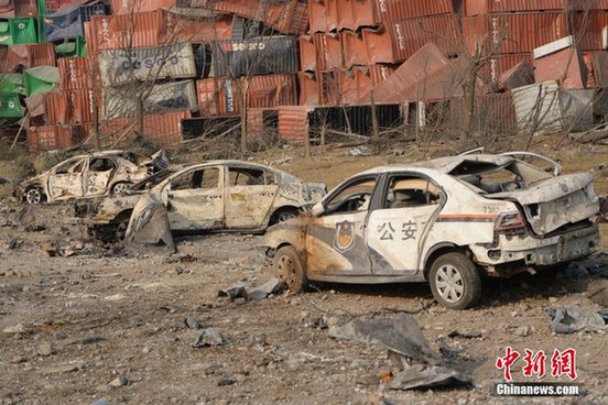 8月16日,天津港“8·12”特别重大火灾爆炸事故核心现场,警车成废铁。 中新社发 廖攀 摄