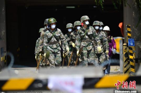 8月17日消息,在天津港“8·12”瑞海公司危险品仓库特别重大火灾爆炸事故核心区附近的万科金域蓝湾小区,救援人员在房屋内清理有坠落危险的物品。当日,天津警备区某舟桥团1100余名官兵进入爆炸事故核心区附近的万科金域蓝湾、启航嘉园等小区,搜索生命迹象、清理危险物品。图片来源:CFP视觉中国