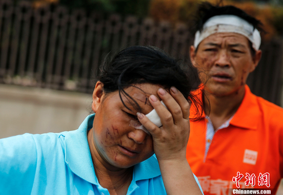 8月14日,几名从天津滨海新区爆炸现场逃离的外地农民工聚在天津滨海区街头,他们出来时没有拿任何衣物,身份证和手机都留在了爆炸现场,那个工厂距离爆炸地不到100米。中新社发 张浩 摄