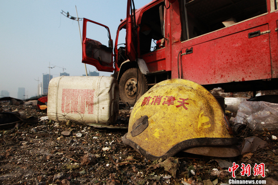 2015年8月15日,天津爆炸事故,现场一片狼藉,消防员的帽子散落在地上。图片来源:CFP视觉中国