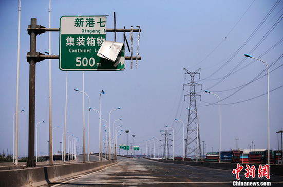 8月16日,天津港“8·12”特别重大火灾爆炸事故核心区高架桥上损毁的指示牌。在当日举行的新闻发布会上,北京军区参谋长史鲁泽表示,爆炸现场已发现上百吨氰化物,并确认位置。史鲁泽称,氰化物集装箱堆集如山,并与各种东西混杂在一起,具体数量不能确定,初步估算,有上百吨。中新社发 刘震 摄