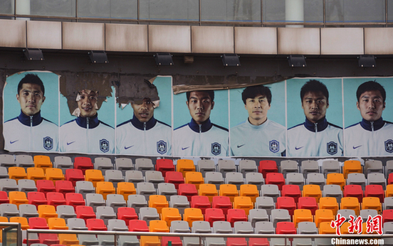 2015年08月14日,天津,记者探访8月12日深夜滨海新区爆炸事故中被波及的泰达足球场。天津泰达球员的头像也受到损毁。图片来源:CFP视觉中国