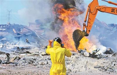 23日,爆炸现场仍可发现烟雾与火点 供图/新华社