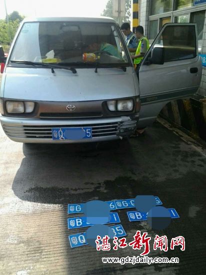 8月22日早上9时25分,勤务二中队民警李卫东带领辅警曾远杰巡逻至茂湛高速公路杨梅收费站时,一辆挂粤QZ×××5号牌的面包车的司机发现执勤警车后飞快地逃离现场。凭着职业敏感,李卫东带领曾远杰联合收费站、路政工作人员对该车进行检查,发现该车挂的粤QZ×××5号牌为伪造的,持有的行驶证也为伪造的。经对该面包车进行仔细检查,在该车上又发现两副(粤G、粤B)的伪造号牌。