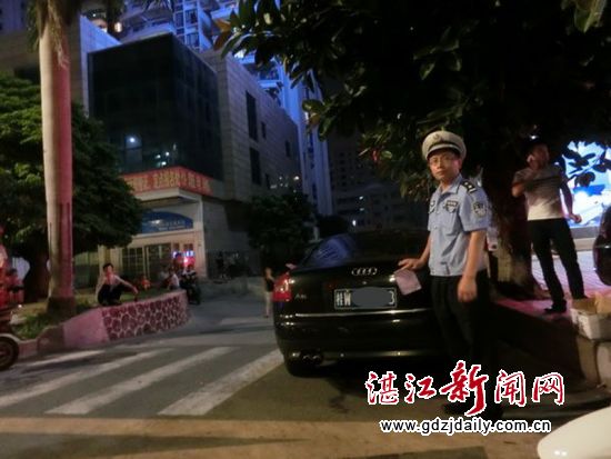 当晚,交警霞山大队勤务三中队民警容剑磊带领两名交通协管员在辖区道路进行夜间巡查时接到警情信息:霞山区椹川大道南骏景花园旁一辆车牌号为桂W××××x的奥迪小轿车违法停车,严重影响该路段其他车辆、行人正常进出。容剑磊立即带领交通协管员前往处理,发现此车疑似假牌套牌车辆,通过公安交通管理综合应用平台查询确认,此车辆号牌登记资料异常,立即对车辆进行暂扣处理。