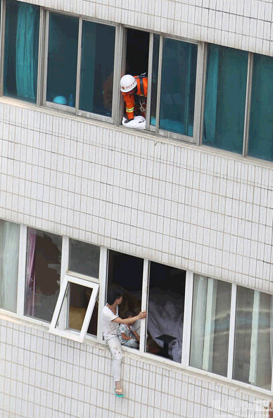 最初孩子十分惊恐,用双手一直拽着窗户。据另一位群众王青说,男子曾两次试图拽开孩子的手,做出要跳的举动,但孩子死死地抱着窗框。消防队员曾尝试从楼上的窗户跳下营救,民警则从隔壁的窗户喊话,稳定其情绪,但很快被该男子识破,情绪变得更加激动,并用手指着楼上的营救人员,要求其退回去,消防员无奈放弃。