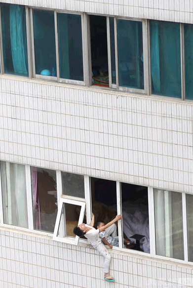男子变得更加警惕,不断探出大半个身子向楼上张望,十分危险。营救人员为保障其安全,只好暂时关闭了楼上的窗户。
