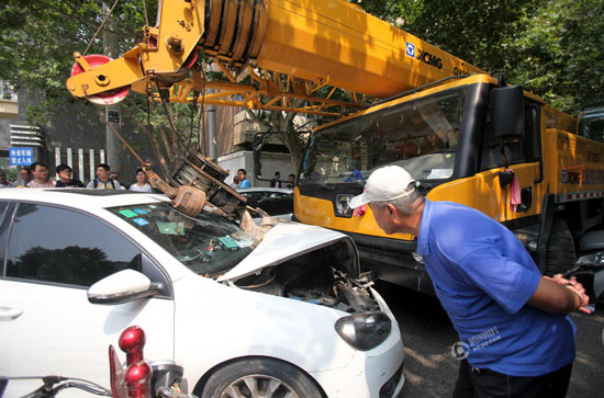 几乎是同时,贴先生又被一阵撞击震到,撞击是从车后发出的,“我的车被顶着,后面还跟的有车,肯定又撞上了其他车”。贴先生被前方的吊车和后面的车辆夹着,此时发动机盖已被挤压起来,“我试图打开车门跳车,但车门变形了,根本打不开。”贴先生的车后面是辆银色奔驰,车主赵先生说,看见吊车撞上高尔夫轿车后,他就往后倒,但根本来不及,他的车也被顶着往后退。在这辆奔驰车的后面,还有辆面包车,面包车的后面是辆三轮车……突然遭遇这样的事情,几辆车的司机都蒙了。图为事发现场。