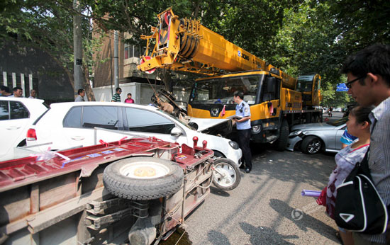 下午5时许,高新大队事故科民警称,事故造成4辆小轿车(其中两辆受到剐蹭)、1辆面包车和1辆三轮车受损,未造成人员伤亡。在初步调查中,吊车司机称,造成这场事故的原因是吊车刹车失控,他并未说自己当时是突发疾病,“我们到现场后,司机的交流很正常,没有发现异样,我们会对其是否突发疾病进行走访调查”。保险公司工作的雷先生说,如果确认吊车司机为癫痫发作,导致车辆失控造成损害,则吊车司机承担全部责任。若确定司机并非癫痫发作,而是车辆突然失控,则属意外事故,保险公司应对受损车辆进行赔偿。图为事发现场。