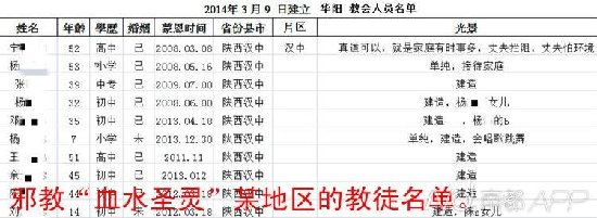 教会中50岁以上人员居多,学历普遍低于高中水平。老龄教徒中鲜有大专这样的“高学历”,不过60岁的王某“认识职分,忠心向上”,被重用为当地教会唯一的“长老”。长老是“血水圣灵”各大特区专设的福音组选拔出来,以作扩张与控制之用,即便七八个人的教会也必须设立长老。教会在扩张之时并非什么人都接纳,在一份新建教会人员名单中,学历最高、76岁的刘某,被特别标注“靠不住”。